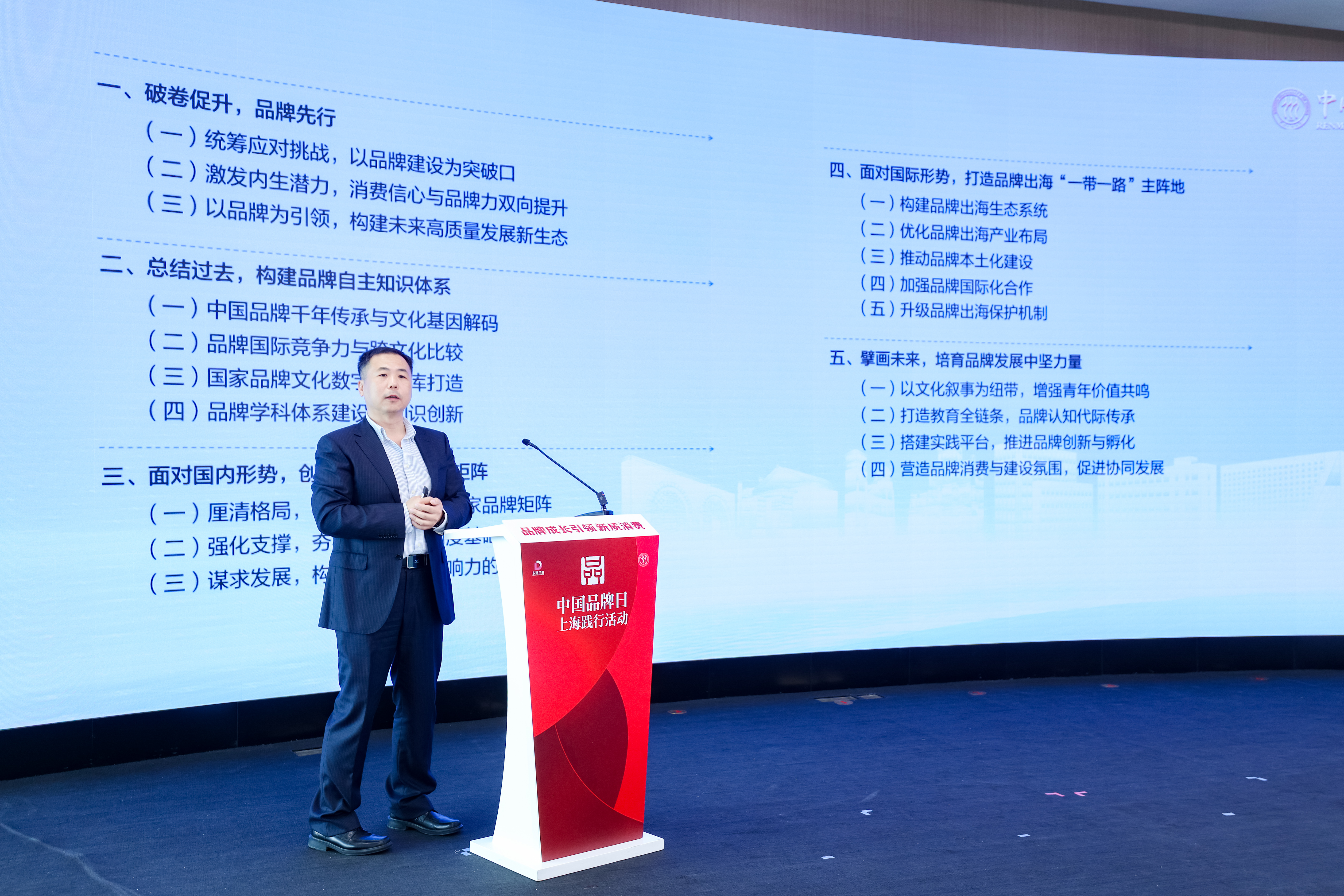 In the release session, Zhang Zelin, Associate Dean of RMBS, presented the “Blue Book on High-Quality Development of Chinese Brands—The Responsibility and Mission of Brand Building” on behalf of the research team of the China Brand Research Institute at RMBS.